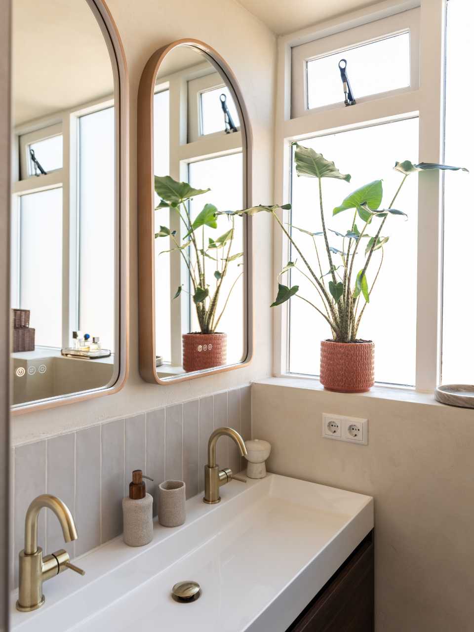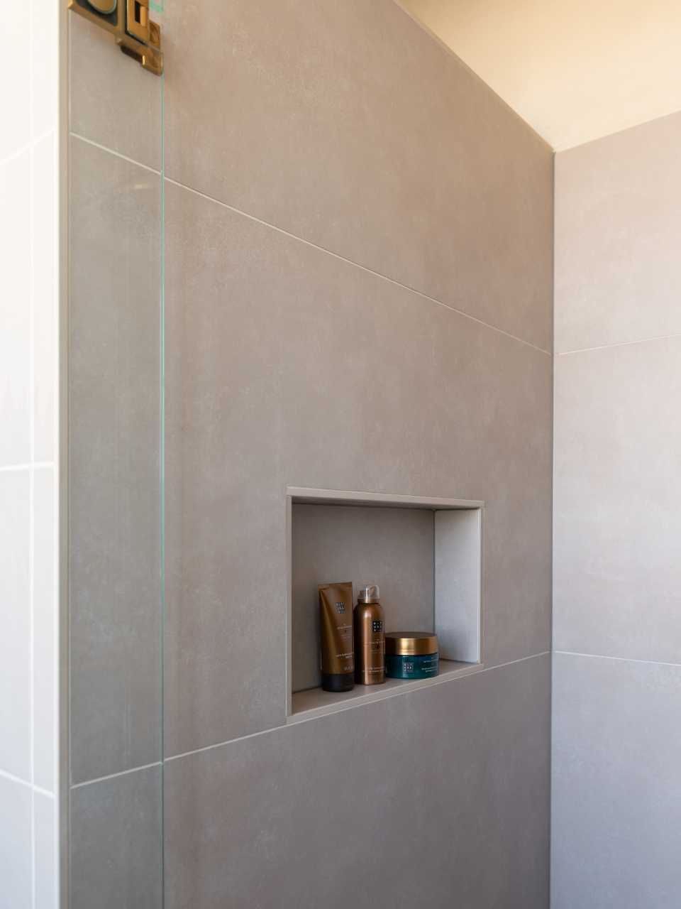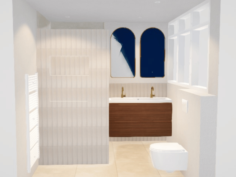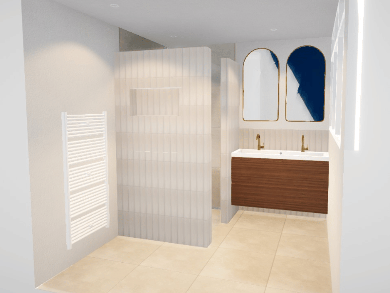 Voor extra detail zijn kleine beige wandtegels toegevoegd. Deze subtiele variatie in formaat geeft net wat meer diepte aan de ruimte. Zo behoud de ruimte karakter, zonder dat het druk wordt. Een slimme keuze voor meer sfeer in de badkamer.