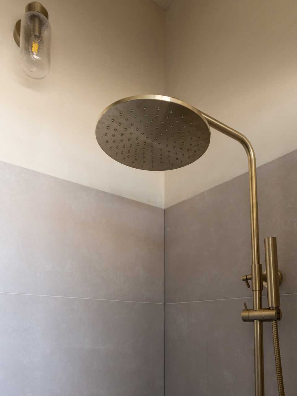 In deze badkamer is bewust gekozen voor messing. De kranen bij de wastafel, de regendouche en de details, sluiten mooi op elkaar aan. Boven het meubel hangen óók nog twee spiegels met een messing kader en dankzij de spiegelverwarming blijft het glas helder. Het zijn juist deze details die het verschil maken en de persoonlijke stijl van familie Mussche laten zien.