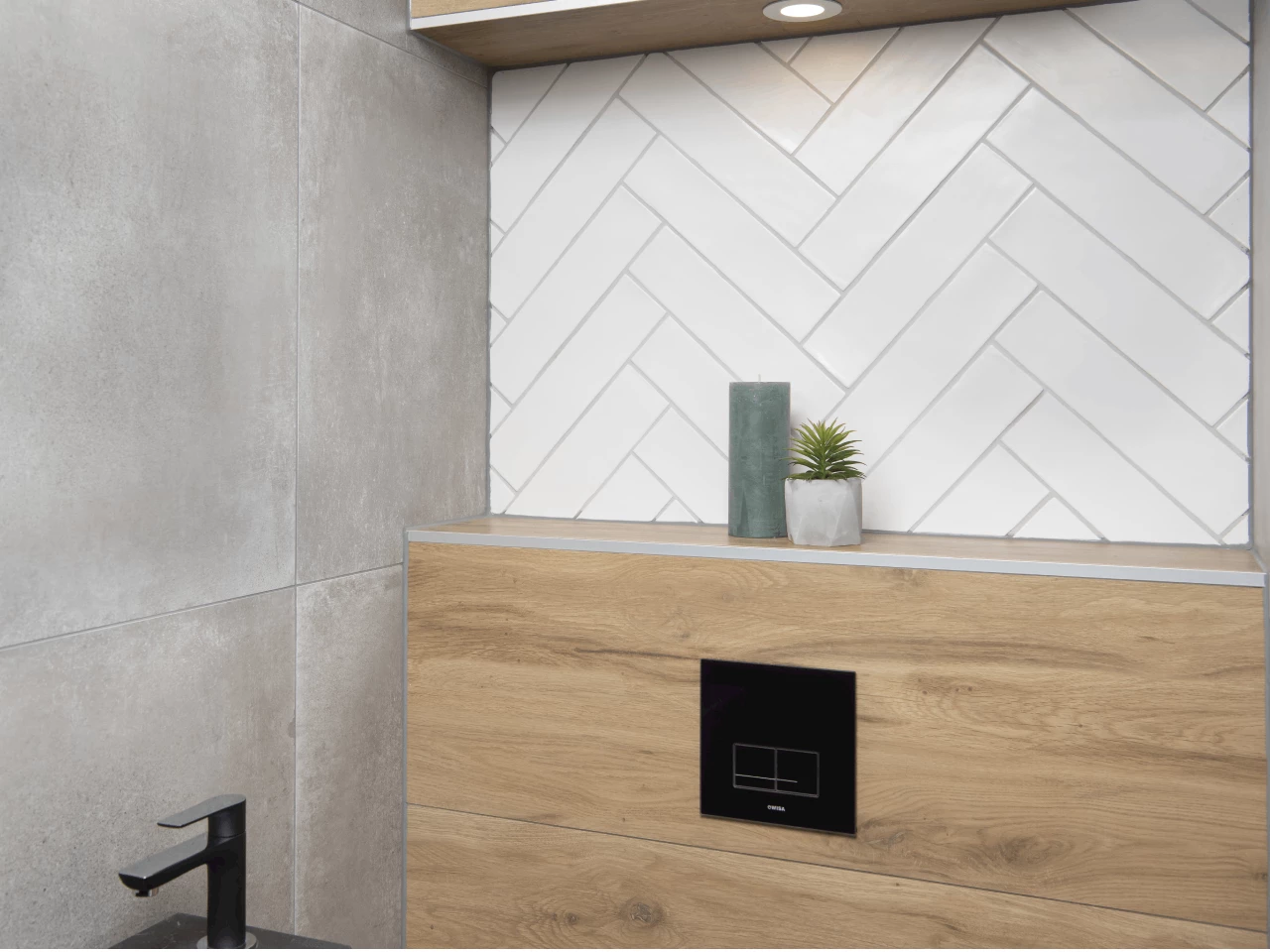 Het complete toilet Fresh Wood bestaat uit een combinatie van drie soorten tegels: betonlook wandtegels, mat witte visgraattegels en houtlook tegels. De houtlook tegels lopen van de vloer door naar de achterwand. Dit creëert extra diepte in de ruimte. Het design toilet is van het merk Blaauw Sanitair en heeft een mat witte kleur. Het Wisa drukpaneel is van zwart glas en is daardoor een bijzonder item. De toiletaccessoires van Wynk zijn van rvs en een duurzame optie. De hardstenen fonteinset is voorzien van een zwart chromen fonteinkraan. Het zwart van het drukpaneel en de fonteinset combineren mooi met elkaar en vormen een strak element in de ruimte.